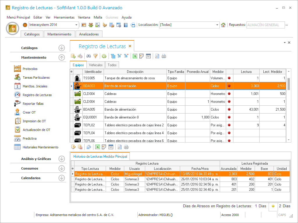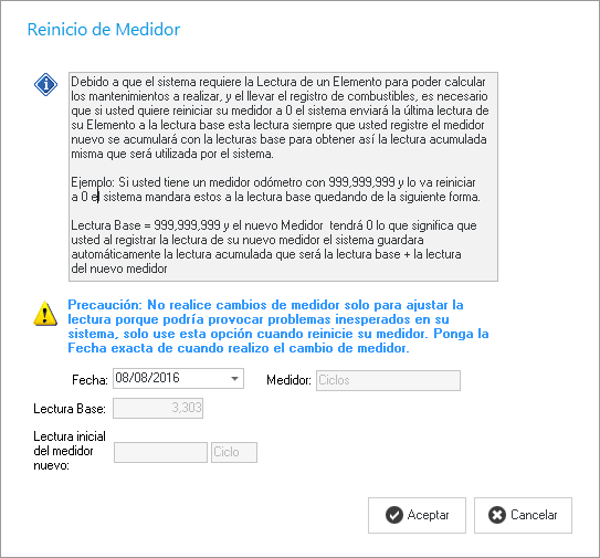 El sistema registra la lectura desde varios módulos, Actualización de Ordenes de Trabajo, Modificar tareas de mantenimiento, etc. Pero si se quiere llevar un registro mas ordenado se puede realizar desde aquí. Hay que actualizar la lectura del vehículo o equipo debido a que si en tareas de mantenimiento tenemos algunas que se realizan cada determinado número lectura hay que actualizarla para que el sistema dispare una Orden de Trabajo para realizarla, si no registrámos la lectura el sistema nunca sabría cuando se tiene que realizar, el único caso donde no se requiere actualizar la lectura es cuando las tareas están programadas por fecha esto es que dependen cronológicamente de la fecha de sistema para disparar los mantenimientos y no requiere de la lectura, pero si registra tareas que tenga programación por periodo de medidor esto lo forzara a llevar este histórico de lecturas.