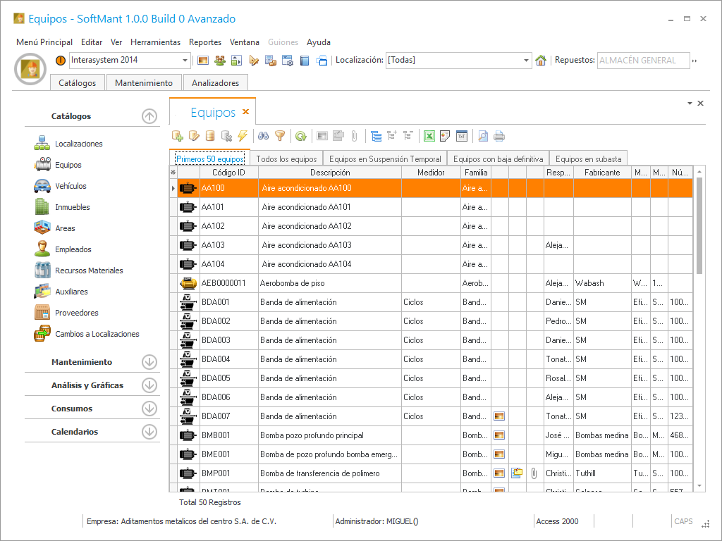 En este módulo se registra la información general de los equipos que contendra nuestras diferentes áreas de nuestra empresa. Esta es la ventana principal del módulo de [Catálogo de equipos] donde a continuación mostraremos algunos botones de uso particular para este.