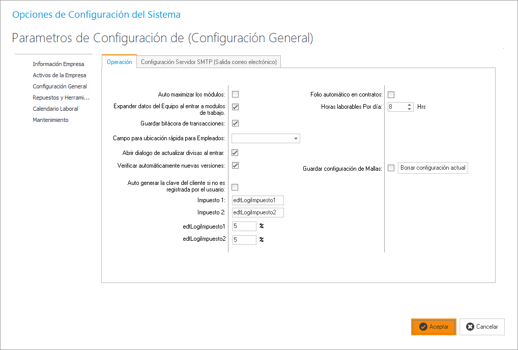 El programa tiene la facilidad de enviar reportes ví correo electrónico, para esto es importante el definir el tipo de salida de correo que nuestro equipo posee, en los casos de correo mediante Outlook podemos determinar como se encuentra, si la salida es por otro software, tendremos que dar los datos requeridos para la correcta salida del correo mediante el programa. Estos datos nos los proporcionara el área de Sistemas de la empresa, SoftMant no los posee.