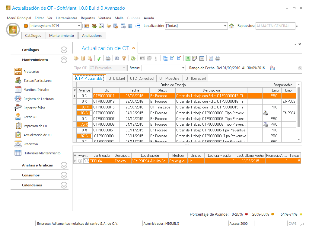 En este módulo se registra en el sistema toda la información referente a las tareas o fallas que se realizaron además de los costos por materiales, mano de Obra, servicios Externos etc. El módulo esta dividido en varias pestañas donde se va registrando la información mencionada.