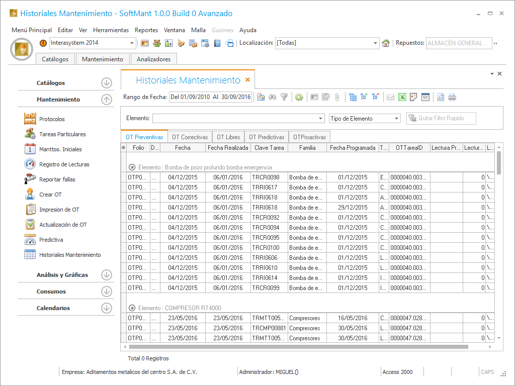 En este módulo se puede analizar la información histórica registrada de los mantenimientos realizados a nuestros activos se cuenta con 2 diferentes tipos de históricos, Histórico de trabajos realizados y el Histórico de consumos por mantenimientos.