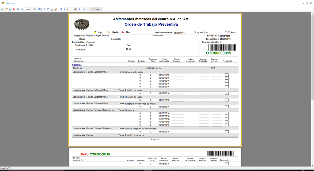 En la siguiente imagen podemos observar la impresión de una Orden de Trabajo Preventiva, la forma en que se organiza su informacion es: