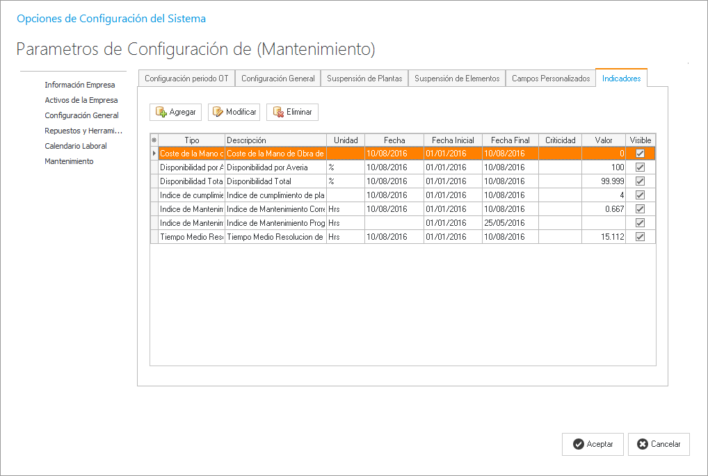 En Indicadores se puede agregar los indicadores que queremos nos brinden información sobre disponibilidad por avería, Disponibilidad Total, etc.