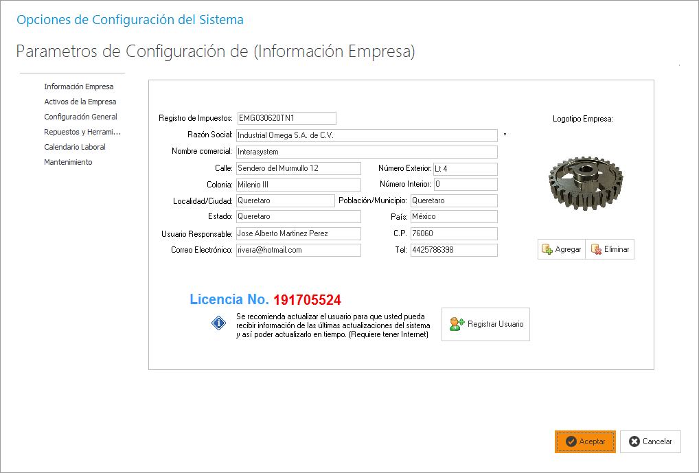 Empresa: Sección donde guardaremos los datos de la empresa como son nombre, razón social, domicilio, teléfono, R.F.C. y el logotipo ademas que si queremos registrar el sistema con el fabricante para recibir notificaciones de mejoras vía correo electrónico aquí lo hacemos entrando a Registrar usuario.