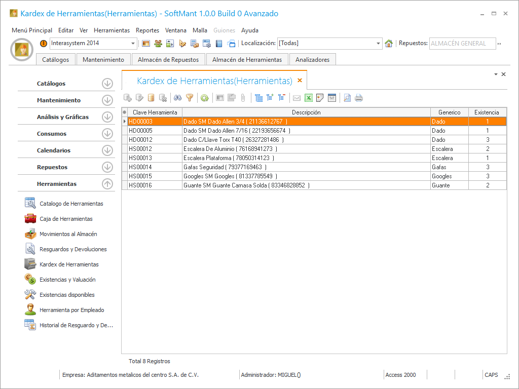 Es el kardex nos sirve para tener la información general de Herramientas con su total de existencias.