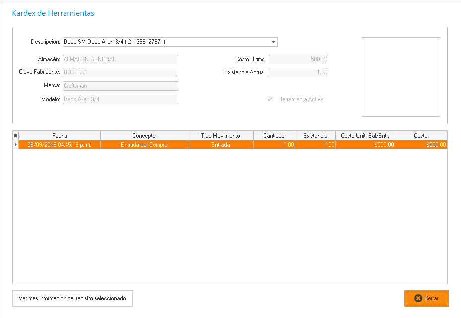 Este es nuestro Kardex que contiene la información principal de la herramienta, la fecha y el concepto del movimiento, existencia actual e historica y el costo de la herramienta.