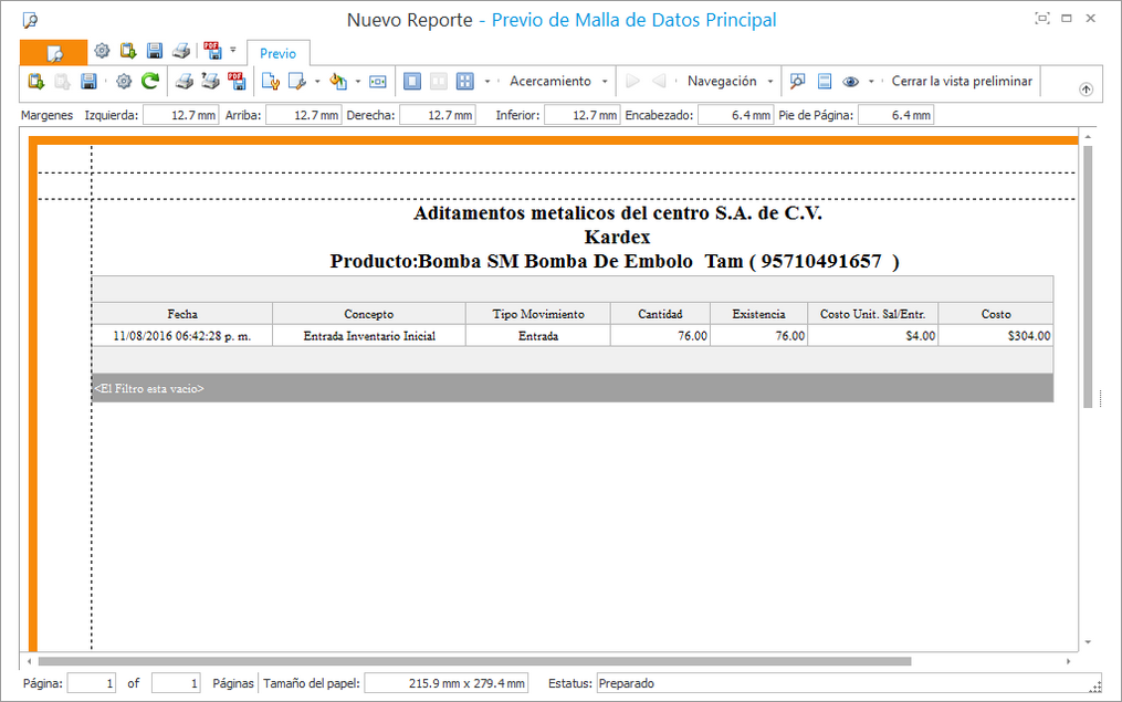 Al darle clic en Imprimir en Kardex Activo nos mostrara una vista previa en la cual podemos mandar a imprimir a una impresora o guárdala en formato pdf.