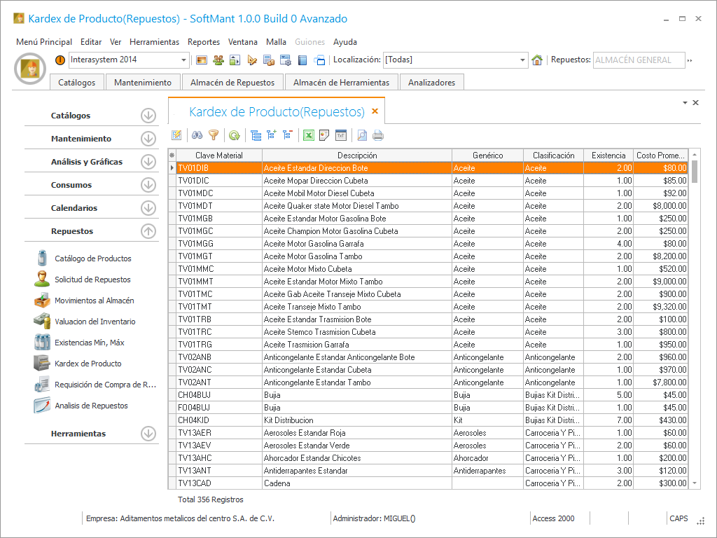 Este es nuestro Kardex que contiene la información principal del repuesto, la fecha y el concepto del movimiento, existencia actual e historica y el costo de producto.