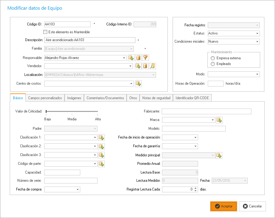 Modificar la información de un Equipo: El sistema no nos permite modificar algunos campos como son los de Lectura, Fecha de Registro, y el Código ID si este esta configurado para que se auto genere. Los campos anteriores no son modificables desde el módulo de equipos porqué requieren de un control mas detallado de su historia, a continuación se detalla donde se pueden modificar estos campos especiales.