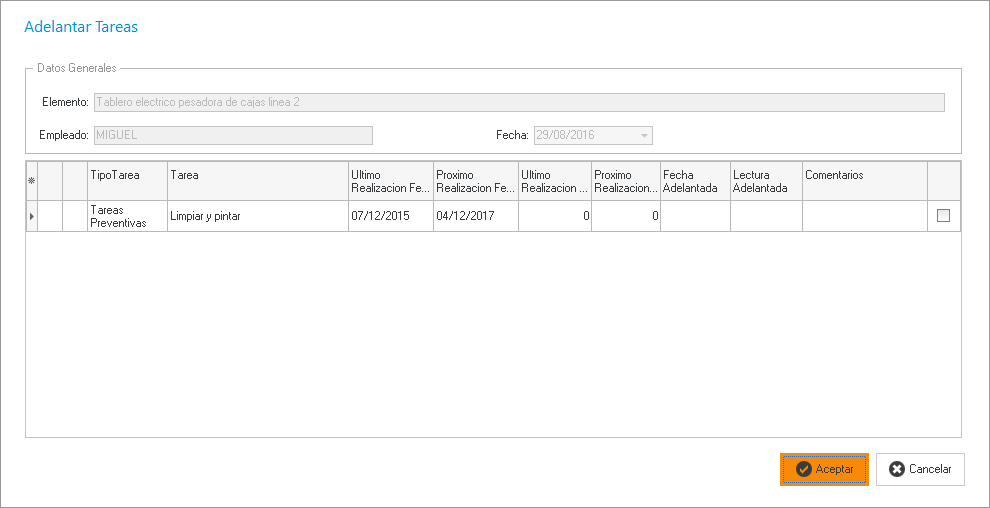 Haga clic en este botón y nos aparecerá una ventana emergente como vemos en la captura de pantalla siguiente y podemos adelantar en el caso de que se requiera realizar una tarea antes de su fecha programada.