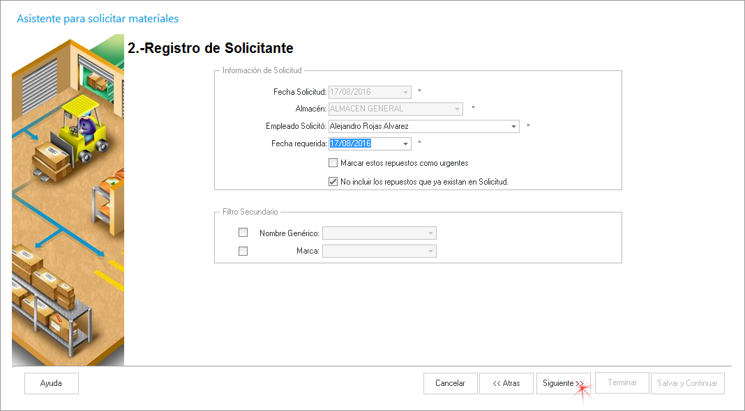 En este paso seleccionamos al empleado que realizo la solicitud del repuesto y la fecha cuando se solicita.