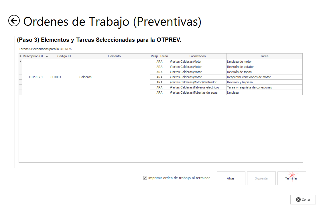 Elementos y tareas seleccionadas para la OTPREV. Tenemos la lista de las tareas de los elementos que le daremos mantenimientos preventivos y para generar la Orden Preventiva le damos clic en el botón de terminar y nos preguntara si queremos generar la vista de la impresión de las Ordenes de Trabajo si tenemos seleccionada la opción de Imprimir la orden de trabajo al finalizar, en caso contrario solo se creara la orden.
