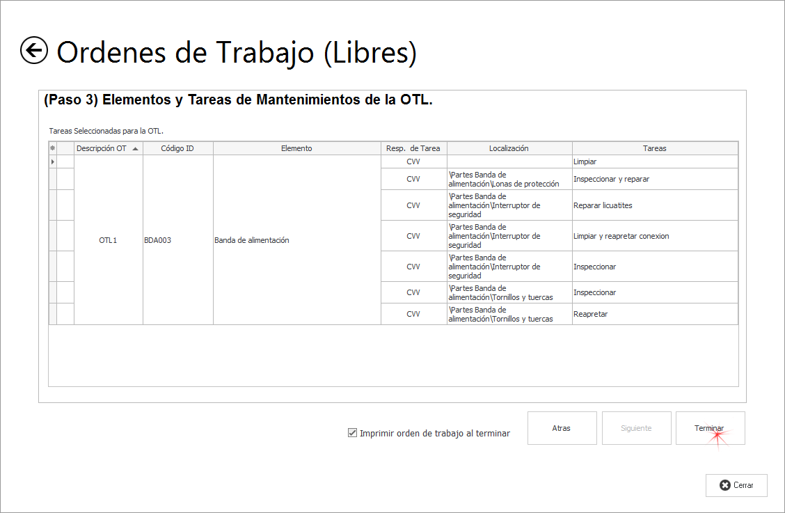 Elementos y Tareas de Mantenimientos de la OTL. En la captura de pantalla siguiente tenemos la lista de las tareas que vamos agregar a la OT. Haga clic en el botón de Terminar para agregar la la lista de las Tareas a la OT.