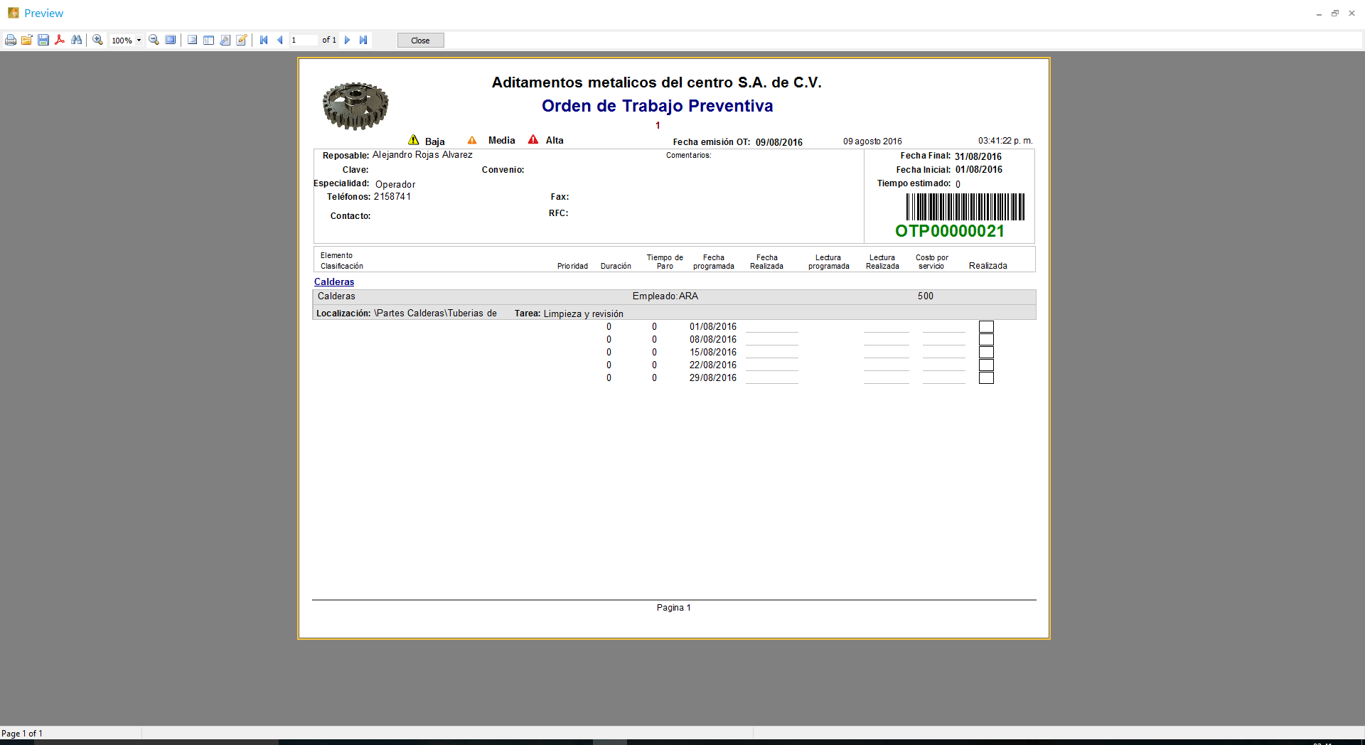 En esta sección marque una opción para imprimir la OT, si quiere que se vea una vista previa, mandarla directamente a imprimir a través de una impresora o si quiere que se envié a su email.
