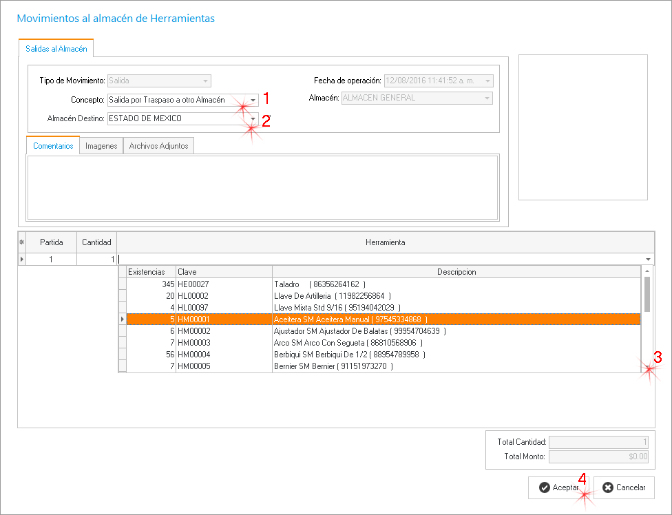 Para que pueda hacer un traslado de herramienta a otro almacén debe de elegir el concepto Salida por Traspaso a otro Amacén, después eliga el almacén destino, eliga las herramientas que va trasladar y por último haga clic en el botón de Aceptar.