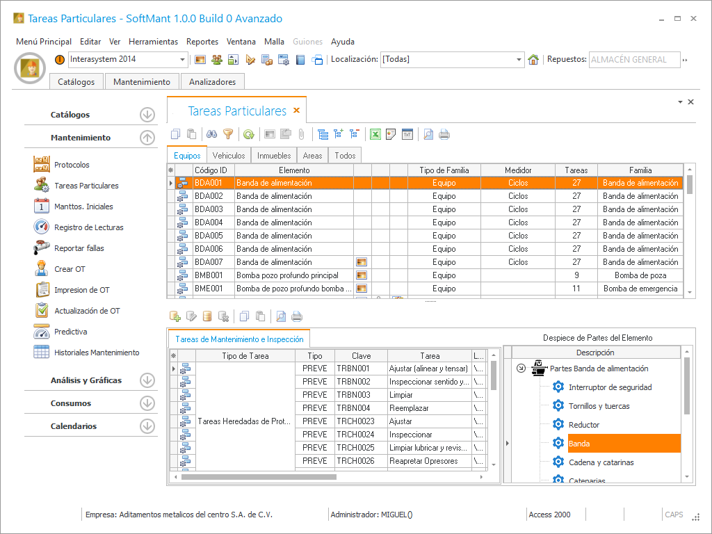 Seleccione la localización del elemento en la que se le va hacer el mantenimiento ejemplo tenemos el elemento Banda de alimentación le podemos asignar la tarea de mantenimiento a la parte Banda.